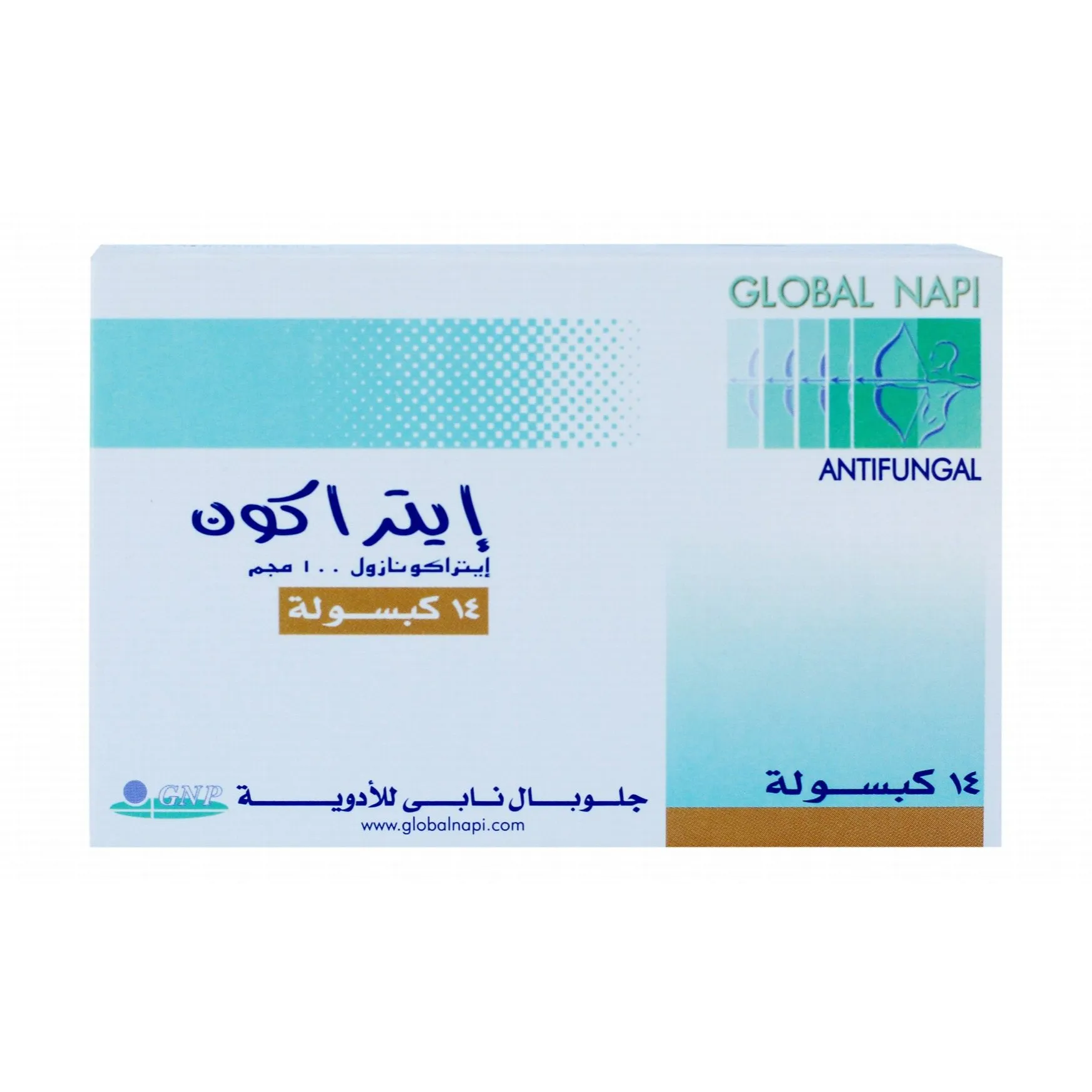 إيتراكون كبسولات مضادة للفطريات تحتوي علي إيتراكونازول وهى مادة تنتمى لمجموعة من مضادات الفطريات واسعة المجال تُسَمى التريازول و له فعالية مضادة للفطريات واسعة الطيف امتصاصه جيد ويمر بسهولة عبر السائل الدموي الدماغي إلى السائل الدماغي الشوكي