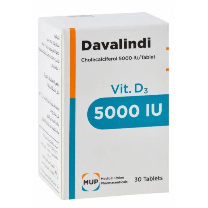دافاليندي ٥٠٠٠ (davalindi) مكمل غذائي يحتوي على 5000 وحدة دولية من فيتامين د، ويستخدم لتعويض نقص فيتامين د من خلال تحسين امتصاص الكالسيوم مما يدعم نمو العظام ويقوي الجهاز المناعي.