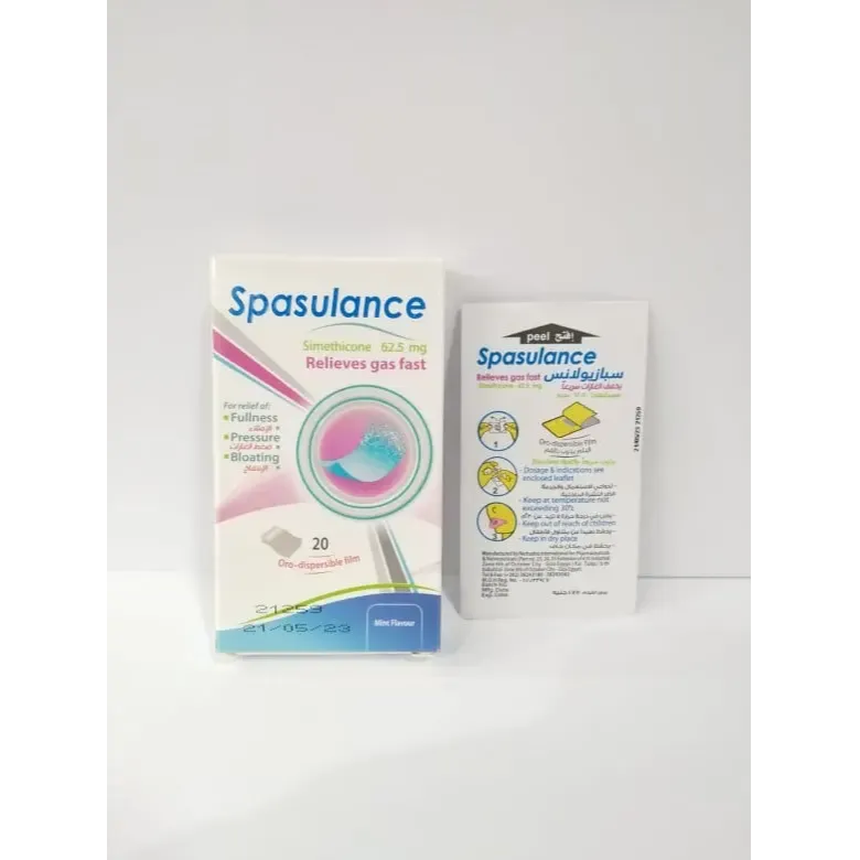 دواء سبازيولانس فيلم (spasulance films) أفلام سريعة الذوبان وسهلة الاستعمال تساعد على التخلص من الإنزعاج الناتج عن الغازات والانتفاخ في العديد من اضطرابات المعدة والقولون حيث يحتوي على مادة فعالة في طرد الغازات.