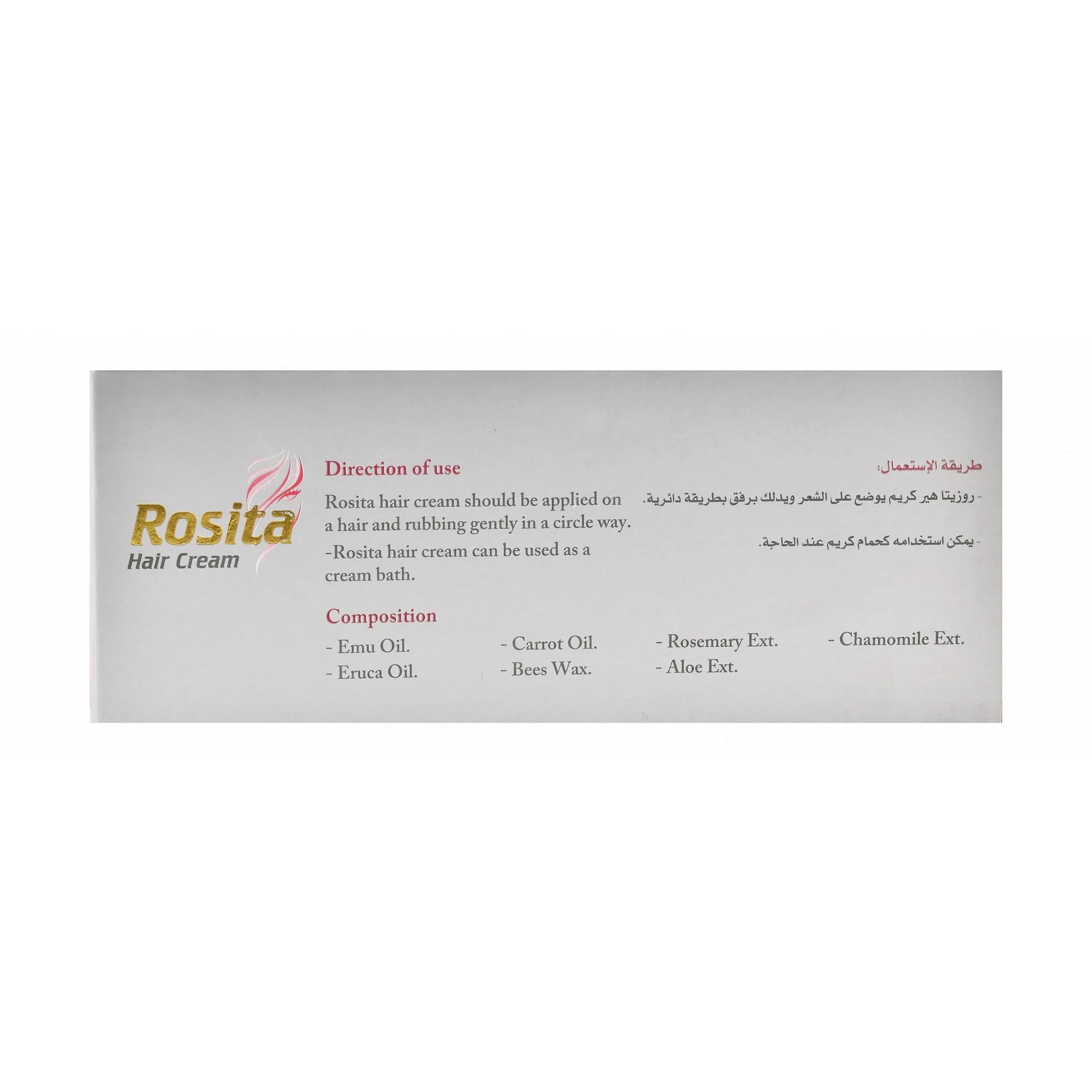 يحتوي كريم روزيتا للشعر على تركيبة من مكونات طبيعية مغذية للشعر وهي: