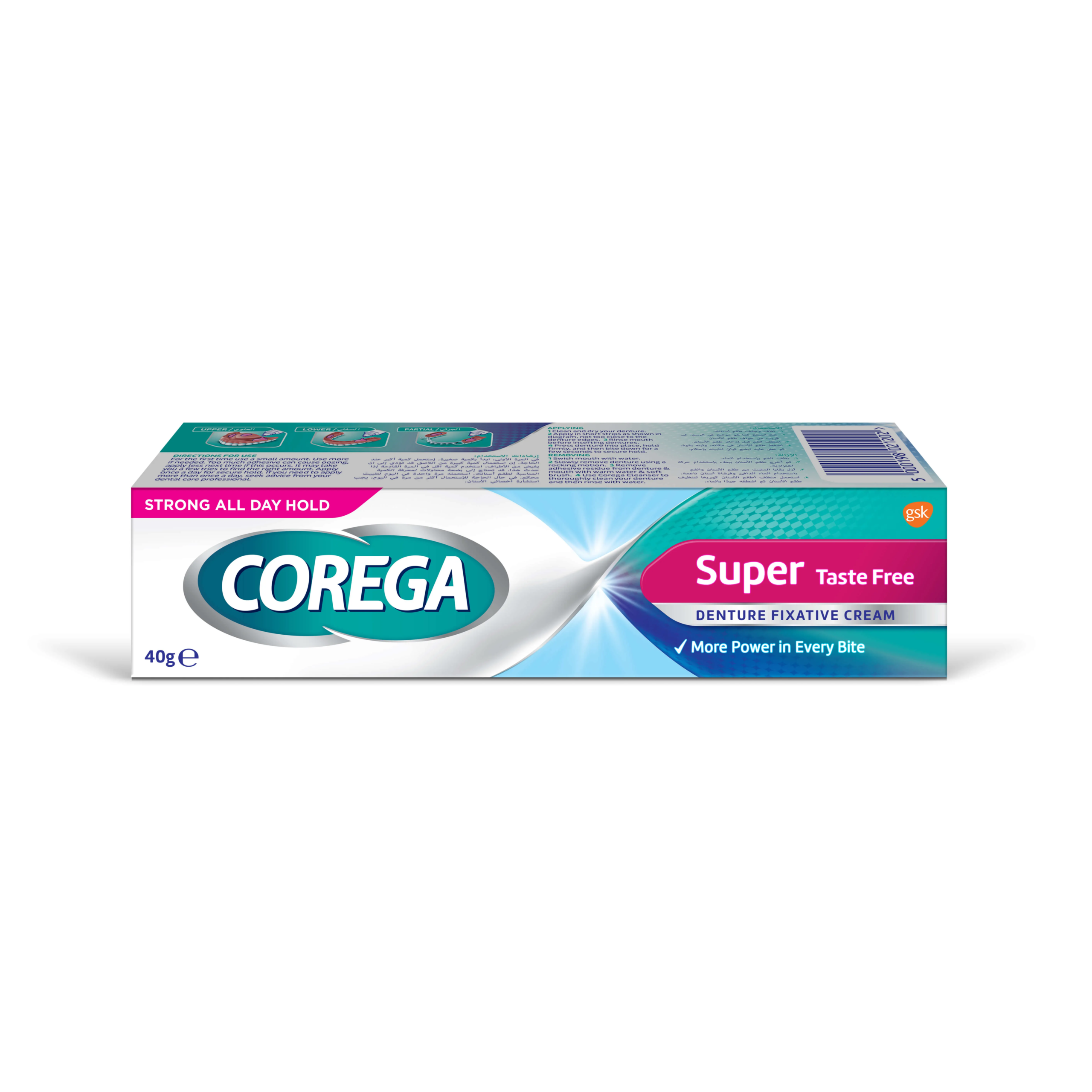 التصاق قوي طوال اليوم.بدون نكهة أو ملونات.تركيبة خالية من الزنك.يمنحك استخدام مادة لاصقة قوة اللصق التي تحتاجها ويمنحك شعورا خاليا من القلق طوال اليوم. لكنك تبحث عن حل لا يؤثر على طعم الأطعمة المفضلة لديك.تم تصميم Corega super cream taste free ليمنحك قبضة تدوم طوال اليوم ولها طعم محايد حتى لا يتعارض المنتج مع الاستمتاع بوجباتك.Corega super cream taste free هو جزء من مجموعة Corega من المواد اللاصقة لأطقم الأسنان غير المنكهة. خالي من الزنك والألوان الاصطناعية.ضبط:نظف بدلة الأسنان وجففها جيدا.ضع ضربات قصيرة من الكريم اللاصق كما هو موضح في الرسم ، وليس قريبا جدا من حافة الطرف الاصطناعي.اشطف فمك قبل إدخال الطرف الاصطناعي.اضغط على الطرف الاصطناعي في مكانه، وامسكه بإحكام، وعض لبضع ثوان لتثبيت الطرف الاصطناعي.لا تنطبق أكثر من مرة في اليوم.أبعد:شطف الفم بالماء.قم بإزالة بدلة الأسنان عن طريق تحريكها ببطء ذهابا وإيابا.قم بإزالة ما تبقى من الكريم اللاصق من الطرف الاصطناعي للأسنان والفم بالماء الدافئ وفرشاة أسنان ناعمة.ط) استخدم منظف أسنان Corega لتنظيف طقم الأسنان تماما ، ثم اشطفه بالماءمقارنة بعدم وجود مادة لاصقة. 12 ساعة تعادل طوال يوم.