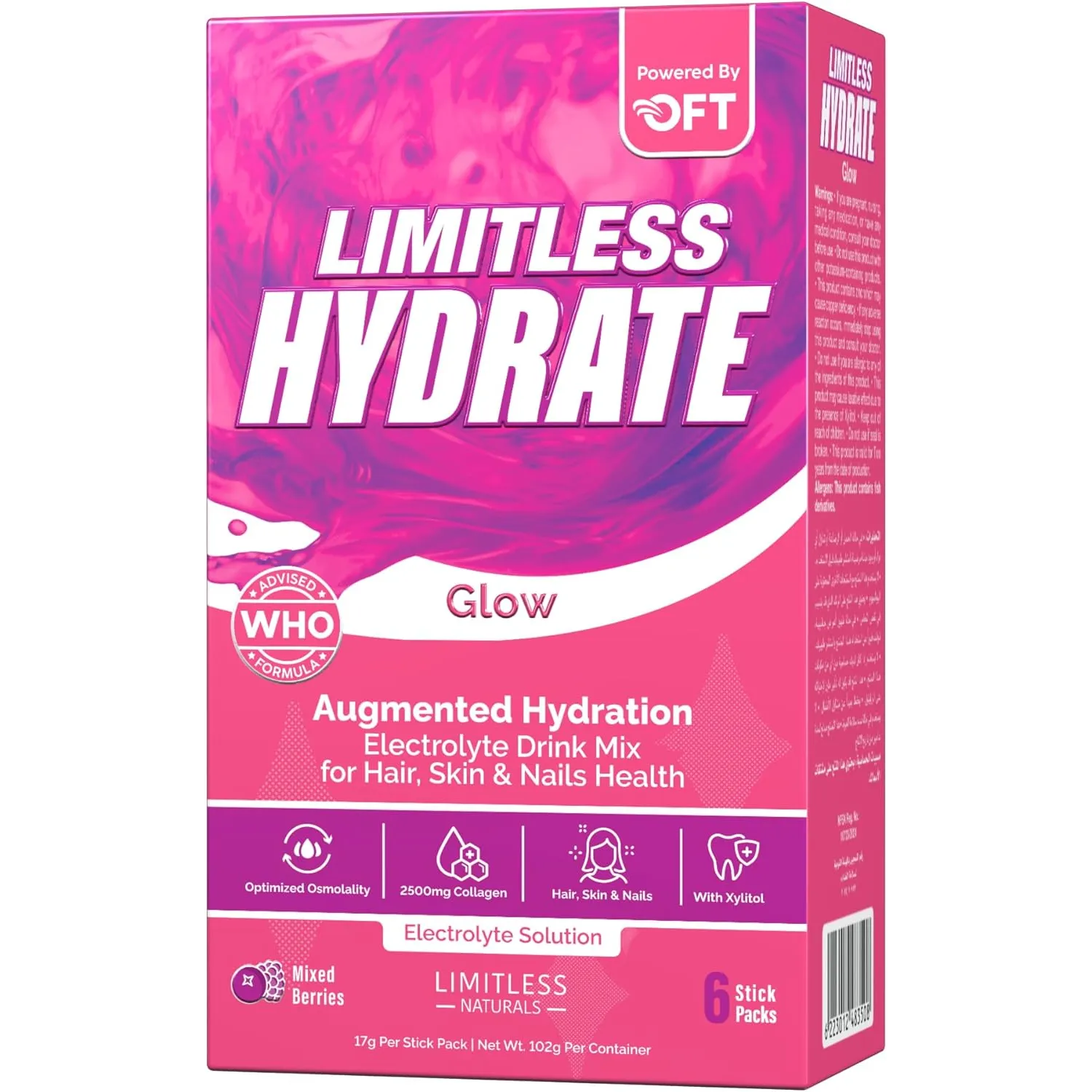 ليمتلس هيدريت جلو (limitless hydrate glow) هو مشروب إلكتروليت غني بالأملاح والمعادن التي يحتاجها الجسم ومعزز بنكهة التوت الطبيعية.يساعد على تعزيز ترطيب الجسم وتعويض الرطوبة والأملاح المفقودة، والحفاظ على صحة الشعر والجلد والأظافر.
