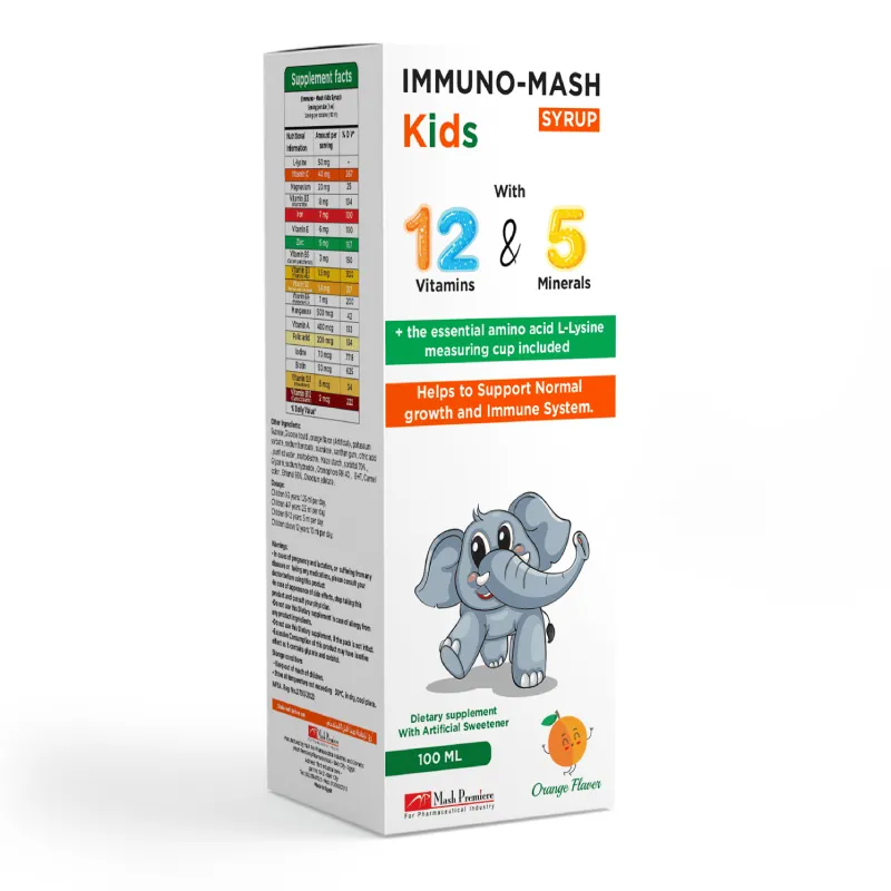 يحتوي الاميونوماش كيدز على تركيبة فريدة ومميزة من نوعها حيث يتكون من 12 فيتامين و 5 معادن بالإضافة إلى الحمض الاميني ل-لايسينيتكون الاميونوماش كيدز من 12 فيتامين : B1, B2, B3, B5, B6, B7 ,B9, B12, A, D, E ,Cيحتوي الاميونوماش كيدز ايضا على 5 معادن : الزنك ، الحديد ، الماغنسيوم ، المنجنيز ، اليودبالإضافة إلى احتواء الاميونوماش كيدز على الحمض الاميني ل-لايسين الذي يساعد على فتح الشهية للاطفالاميونوماش كيدز يدعم المناعة للاطفال لاحتوائه على فيتامين: A , D , E, C بالإضافة إلى الزنكاميونوماش كيدز يدعم نمو الاطفال بشكل صحي لانه يتكون من: الحديد ، المنجنيز ، الماغنسيوم ، اليودوفيتامينات B complexاميونوماش كيدز يرفع ويعمل على زيادة الشهية لدى الأطفال لاحتوائه على ل – لايسيناميونوماش كيدز متوفر بطعم البرتقال