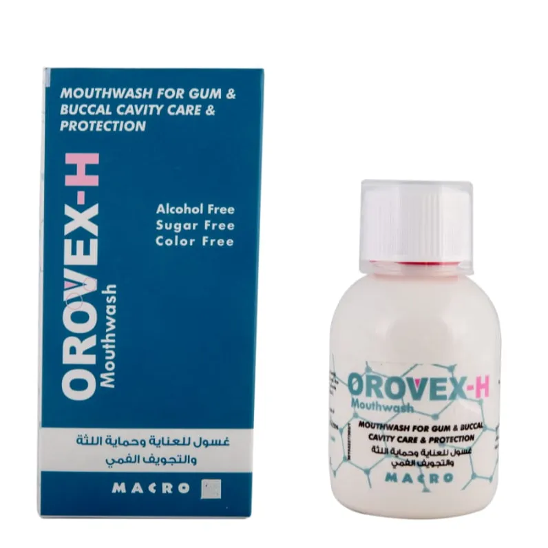 ما الفرق بين orovex و orovex h ؟ يحتوي Orovex العادي على الكلورهيكسيدين وخلاصة النعناع والزعتر ويُستخدم كمطهر للفم في الحالات البسيطة والروتينية. أما غسول orovex-h mouth فيحتوي على تركيبة متطورة تشمل الكلورهيكسيدين وحمض الهيالورونيك ومكونات طبيعية مثل البابونج والزعتر والآذريون، مما يجعله مناسبًا لحالات قرح الفم وآلام الاسنان إذ يساعد على تطهير الفم وتسريع التئام الأنسجة.